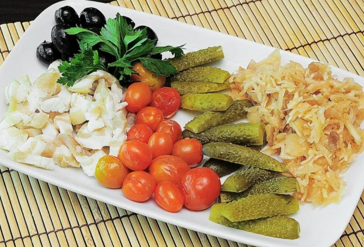 Огурчики соленые, черри с чесночком, капуста маринованная, сало соленое