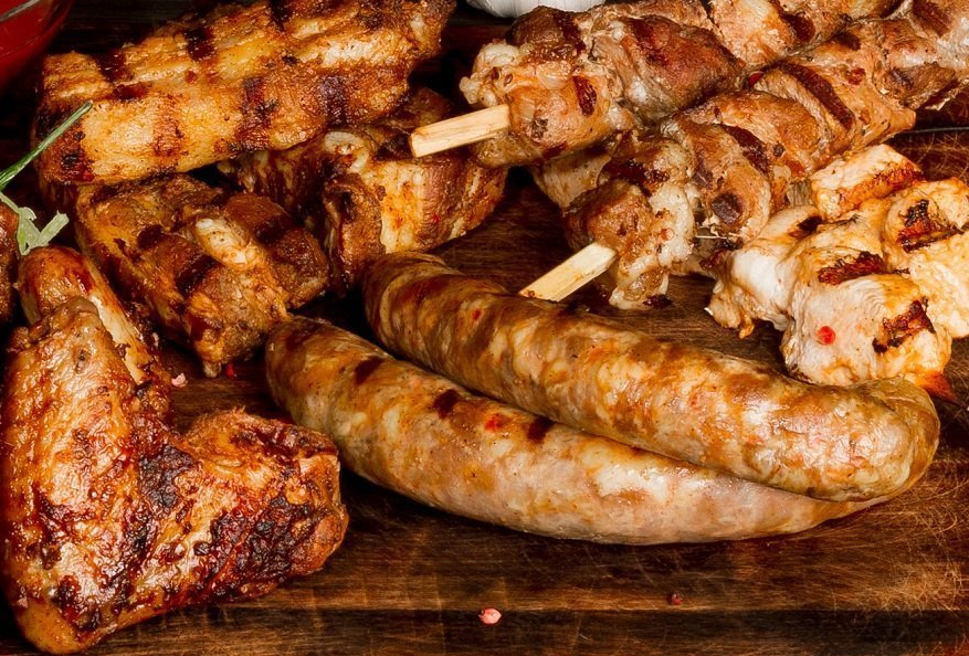 Свиная шея, бедро без кости, свиные ребрышки, колбаски, крыло куриное.