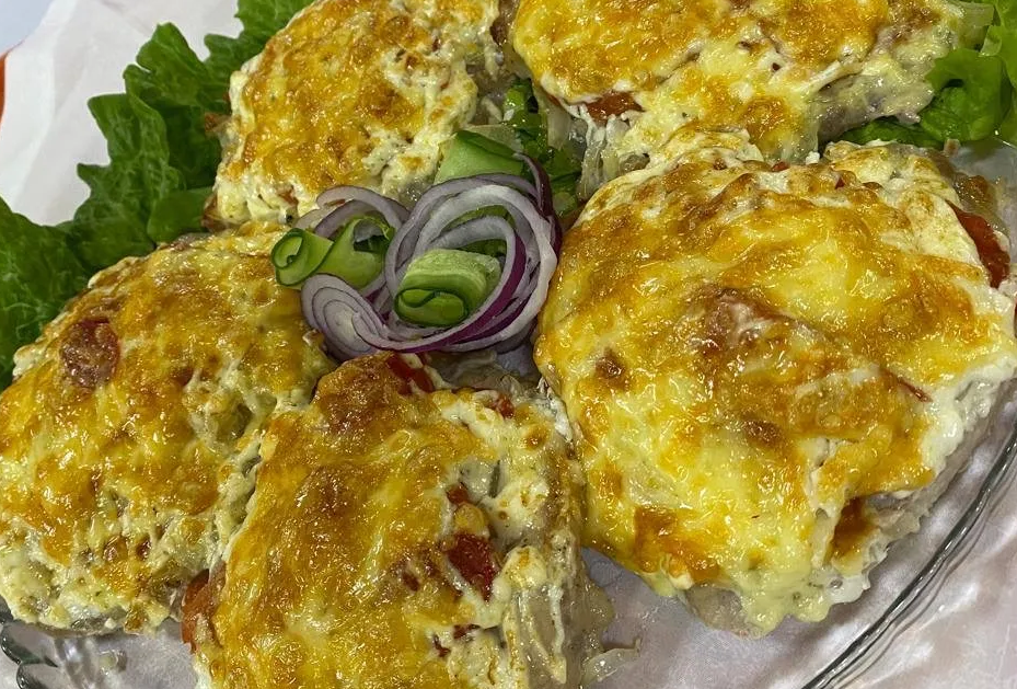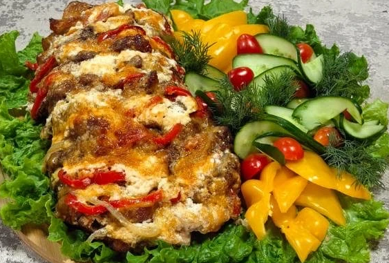 Шея свиная, помидор, болгарский перец,масло сливочное, сыр моцарелла