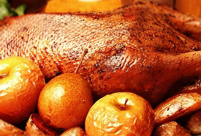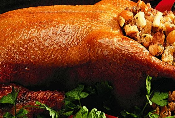 Гусь, специи, чеснок, масло, яблоки, карамель.