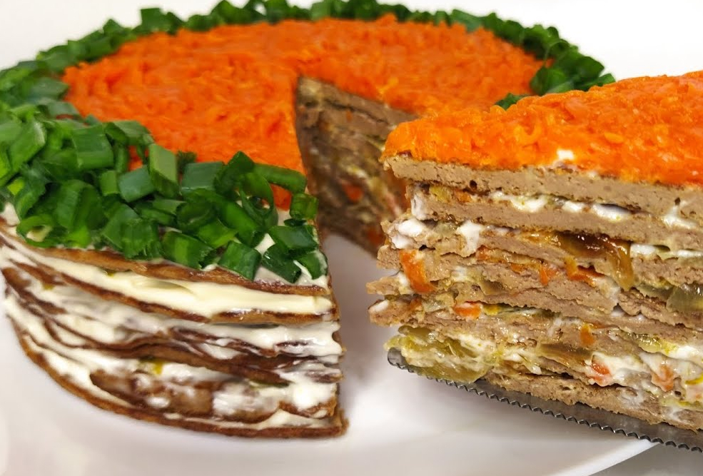 Печень говяжья, лук, морковь, майонезный соус, сыр, грецкий орех