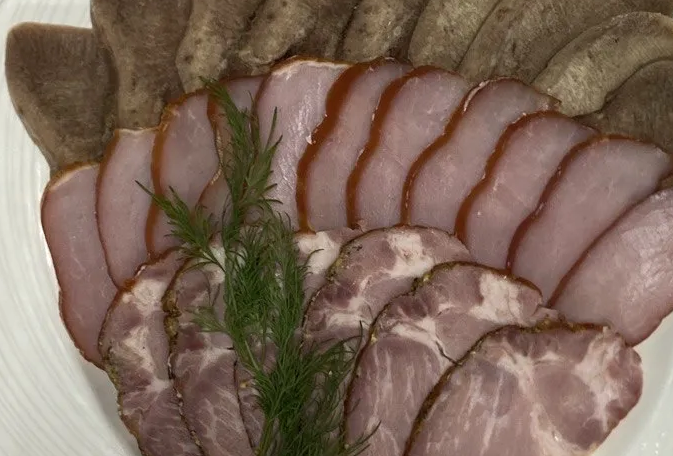 Буженина, язык говяжий, мясо сыровяленое, горчица, зелень