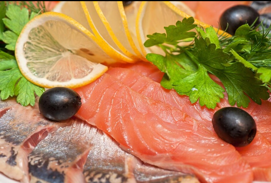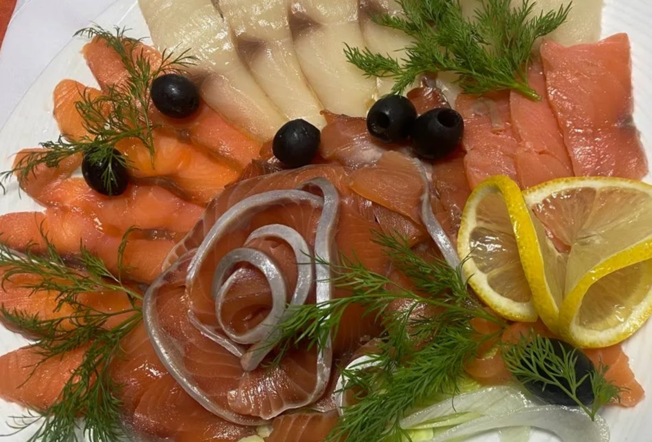 Кета м/с, горбуша х/к, сельдь м/с, лимон, маслины, зелень