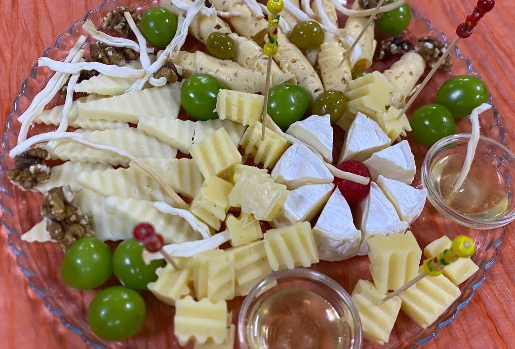 Маасдам, дор-блю, пармезан, бри, орехи, мед, виноград.