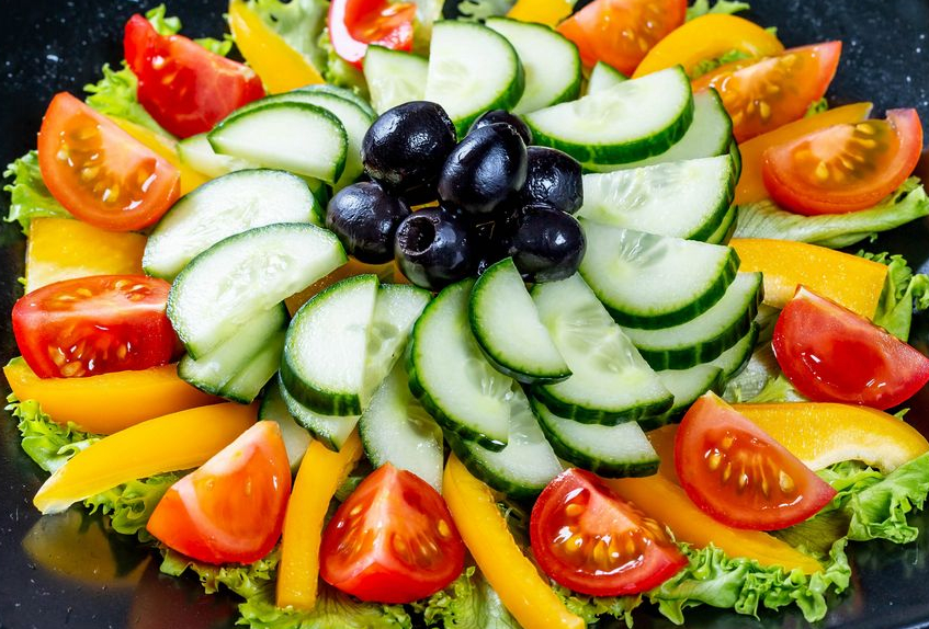 Свежие огурцы, помидоры, перец болгарский, маслины, лист салата, зелень