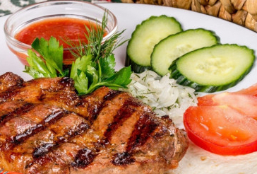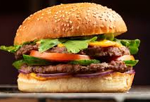 Котлета из мраморной говядины, огурец, помидор, лук красный, сыр, соус